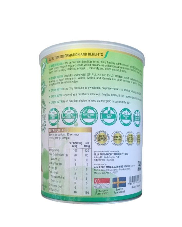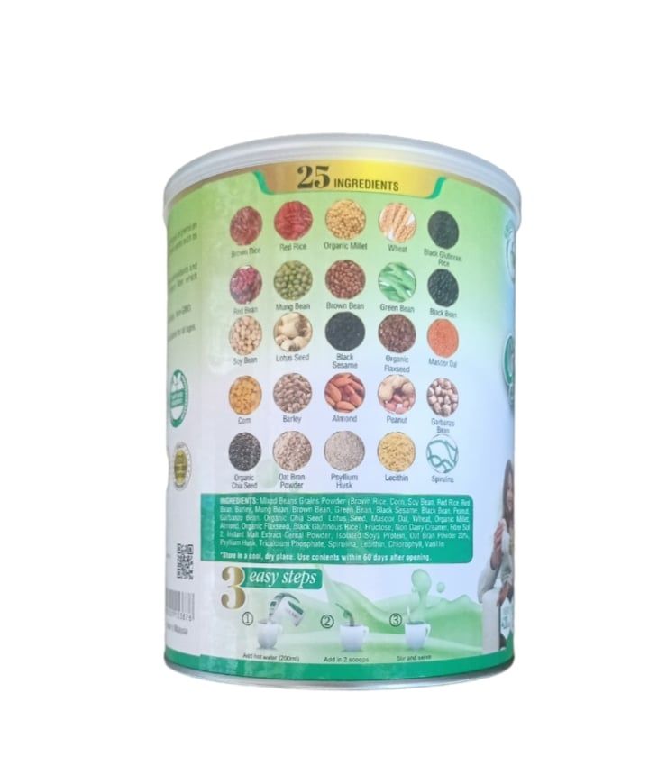 Sữa 25 Green Nutri – Dinh dưỡng từ thiên nhiên giúp tăng cường sức khỏe trong 8 tuần. Sản phẩm là hỗn hợp dinh dưỡng tuyệt hảo cho nhu cầu dinh dưỡng lành mạnh. Với 25 loại ngũ cốc nguyên hạt nguyên cám. Cung cấp đầy đủ dinh dưỡng. Vitamin và khoáng chất theo tỷ lệ khoa học của các chuyên gia hàng đầu Singapore. Được nhập khẩu 100%. Thương hiệu Singapore và sản xuất trên dây chuyền hiện đại tại Malaysia.