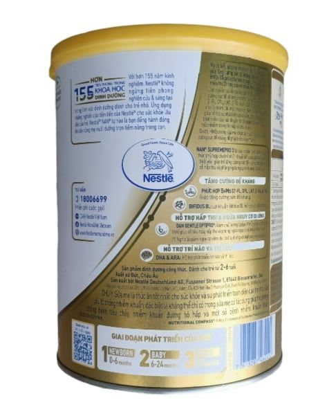 Sữa Nan Supreme 3 bổ sung 5HMOs + HA giúp hệ miễn dịch của trẻ khỏe mạnh, cùng 100 triệu lợi khuẩn Probiotics Bifidus nhằm tăng cường sức đề kháng. Đặc biệt, với đạm chất lượng từ Nestlé, giúp con dễ hấp thu và cần thiết cho khởi đầu vững chắc. Vì đạm con hấp thu hôm nay rất quan trọng cho, Khởi đầu vững chắc, khỏe mạnh dài lâu. DHA cho sự phát triển não bộ và thị giác của trẻ.