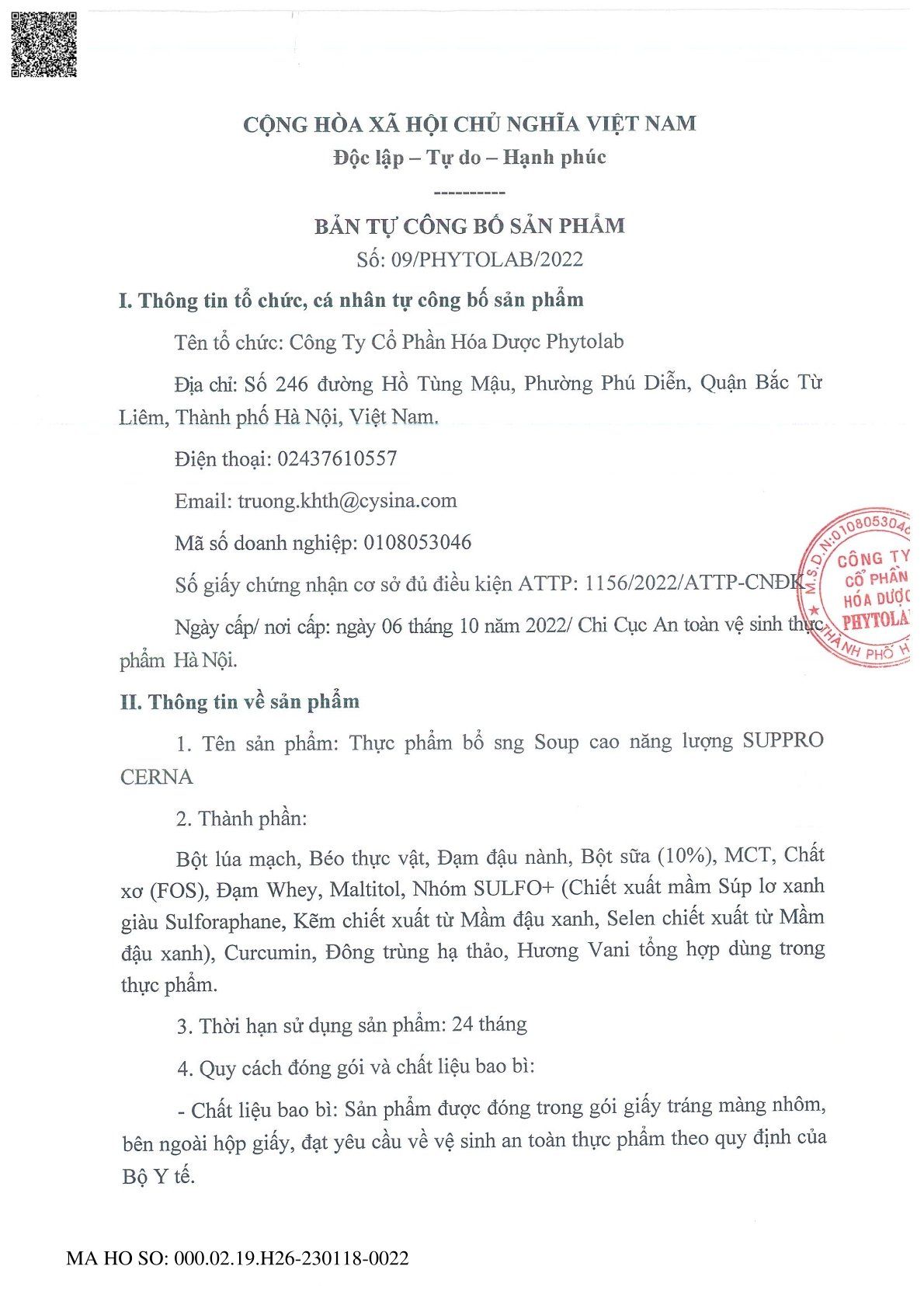 Số ĐKSP: 09/PHYTOLAB/2022