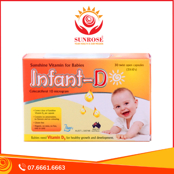 Infant D là vitamin từ ánh nắng quan trọng cho trẻ em. Infant D được sản xuất nhằm cung cấp liều chính xác vitamin D3 nhất cho trẻ em. Không giống các dạng vitamin D3 nhỏ giọt khác rất khó để dùng chính xác liều lượng. Viên infant D giúp bổ sung chính xác liều lượng, vệ sinh và dễ mang theo sử dụng.